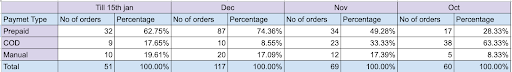 Upon scrutinizing sales data, a notable trend favoring prepaid transactions over cash on delivery (COD) was observed. In response, the decision was made to halt COD transactions for 15 days starting January 19th, 2024.