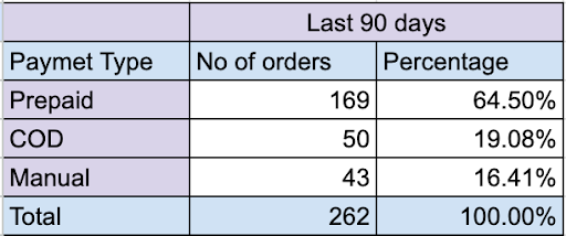 We’ve observed a trend over the past six months where the brand has shown a greater reliance on prepaid orders rather than cash on delivery (COD) orders. Additionally, most of the fake orders are placed using the COD payment method.
