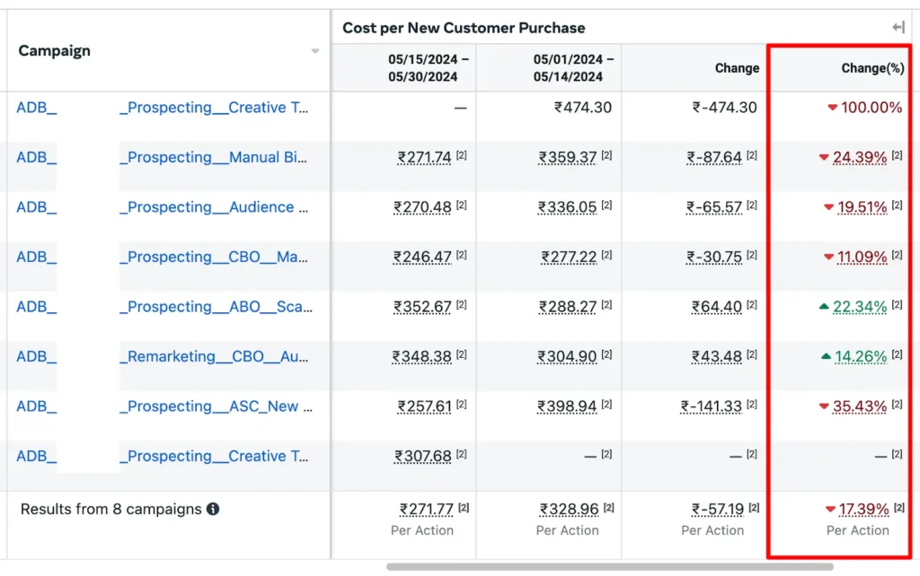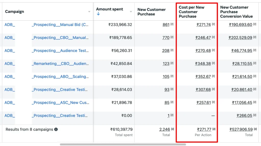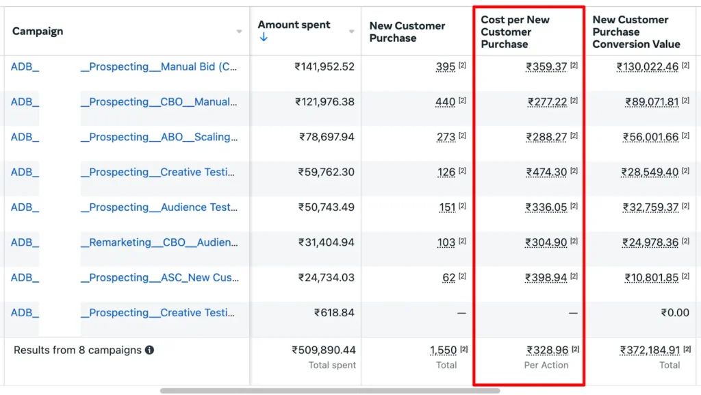 We set the kill nCAC at ₹250 which meant in prospecting campaigns anything higher than that will be paused.