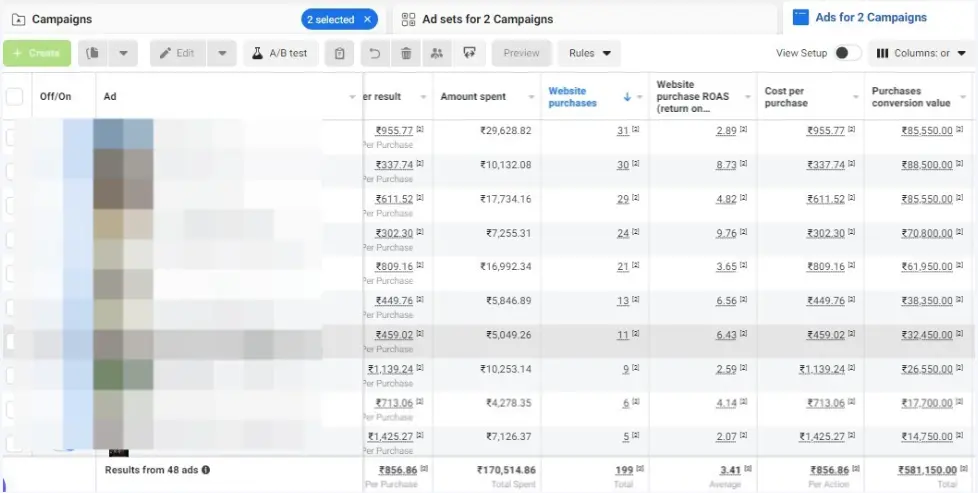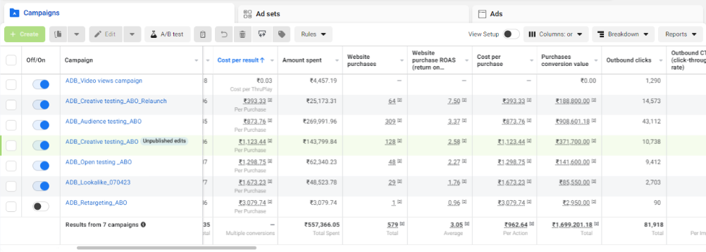 We kept a CPA target for the brand to optimize the ad performance. In the Post IOS 14 era, the attribution setting of Facebook changed, leading to under-reporting / over-reporting. In order to optimise the campaigns, we need to use backend analytics like woocommerce and Google Analytics to track the performance. Optimising based on CAC, and backend tracking helps to maintain the required ROI targets.