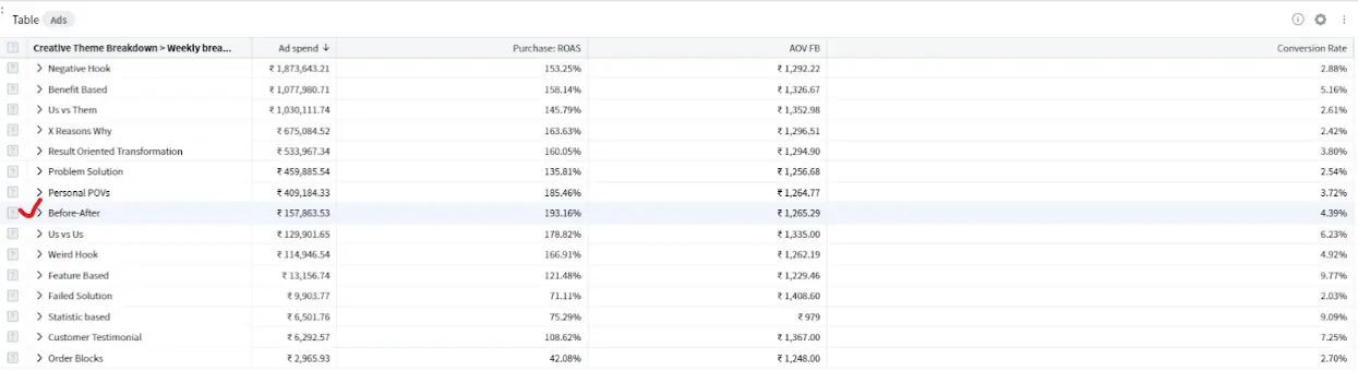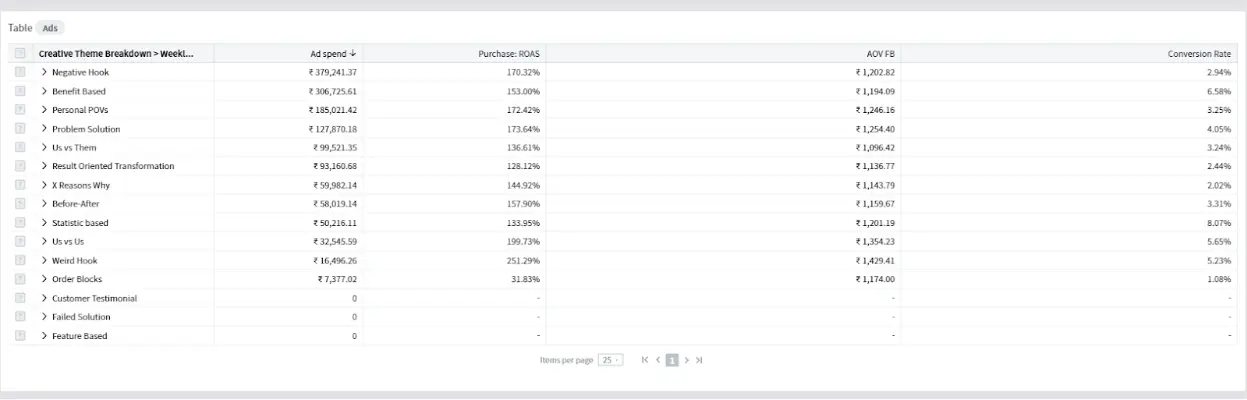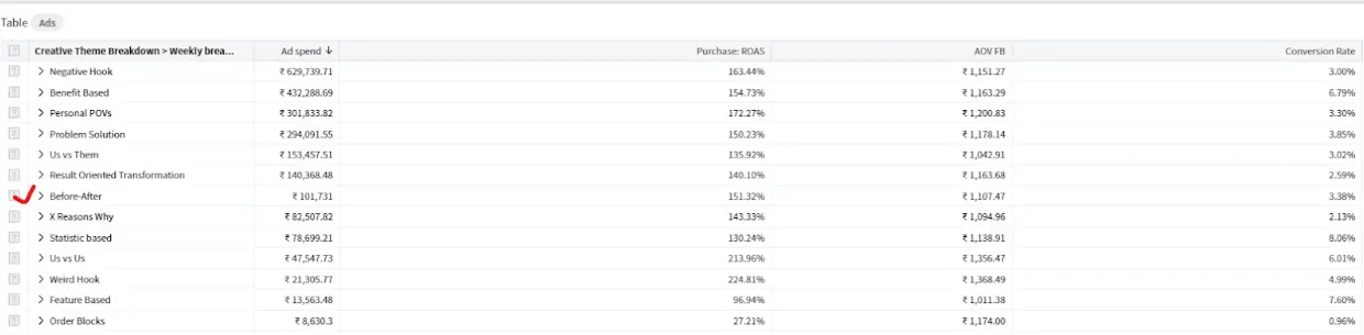 Strategic Alignment: Creative theme analysis ensures that the chosen theme aligns strategically with the brand’s goals and values. By doing such analysis, we are able to understand which creative theme is having good conversion rate and ROAS, based on which we can test out multiple creatives to scale a brand.