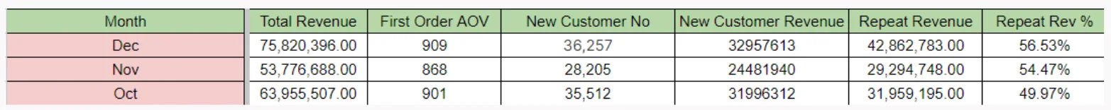 In the Month of December the number of new customer aquisition was 36251 out of which 10.8% people have come back and bought in the same month itself i.e in Month 0 which is the highest comparing past months, which means we have aquired quality customers whose retention rate is high.