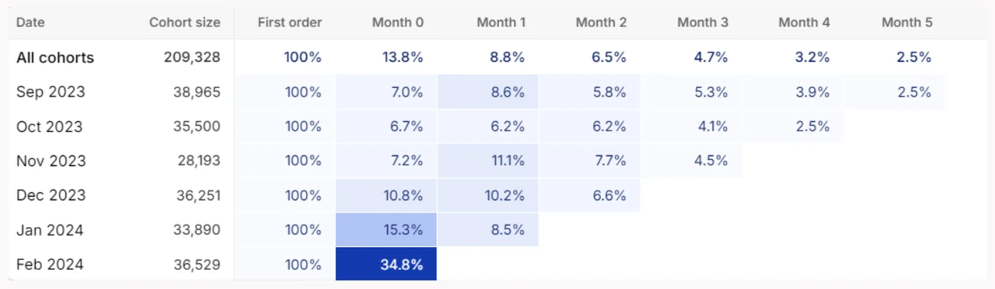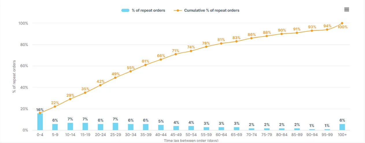 Here is the data of last 6 months % of repeat orders in terms of No. of days-According to the analysis 16% of repeat orders in a time span of 0-4 days.