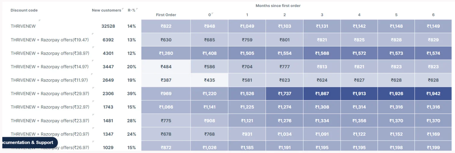 The Evergreen coupon of THRIVENEW in Last 6 Months has been used by 32528 new customers and the repurchase rate is 14%, and Rs. 822 accumulated sales per customer in their first order, adding to that around Rs. 948 accumulated sales per customer in the same month of their first purchase.