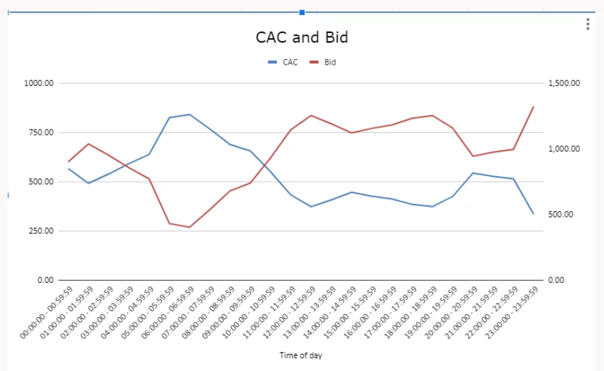 We tackled the issue by creating an Hourly bid cap campaign in our account. This clever setup allowed us to adapt our bids based on the changing cost of acquiring customers(CAC) throughout the day. Essentially, when the CAC was lower, we increased our bids, enabling us to spend more budget during these optimal times for acquiring customers. Conversely, when the CAC was higher, we lowered our bids, ensuring we didn’t overspend during less favorable periods.