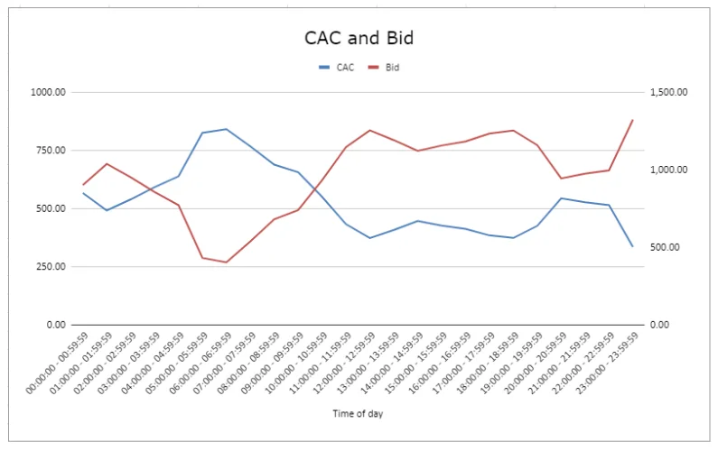We tackled the issue by creating an Hourly bid cap campaign in our account. This clever setup allowed us to adapt our bids based on the changing cost of acquiring customers (CAC) throughout the day. Essentially, when the CAC was lower, we increased our bids, enabling us to spend more budget during these optimal times for acquiring customers. Conversely, when the CAC was higher, we lowered our bids, ensuring we didn’t overspend during less favorable periods